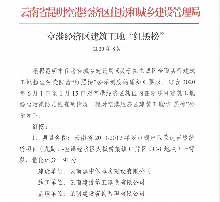 此次“紅黑榜”是昆明空港經(jīng)濟(jì)區(qū)住房和城鄉(xiāng)建設(shè)管理局根據(jù)昆明市住房和城鄉(xiāng)建設(shè)局《關(guān)于在主城區(qū)全面實(shí)行建筑工地?fù)P塵污染防治“紅黑榜”公示制度的通知》要求,對空港經(jīng)濟(jì)區(qū)轄區(qū)內(nèi)在建的80多個建筑工地進(jìn)行了揚(yáng)塵污染防治情況檢查后評出的結(jié)果。