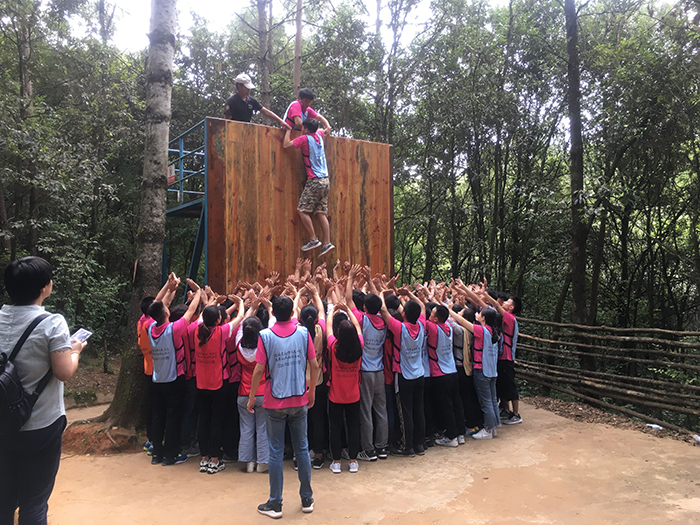 新員工們被分成了四支隊伍,通過七米高空作業(yè)、呼啦圈傳遞、運球接力、九人十腳、團結墻項目等不同的項目訓練,體會到了凝聚力對一個團隊的重要意義。