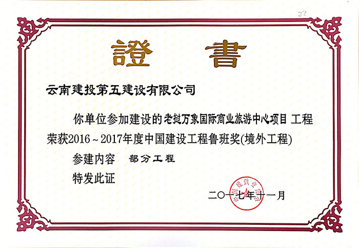 11月6日,紀念魯班獎創(chuàng)立30周年暨2016~2017年度創(chuàng)精品工程經(jīng)驗交流會在北京釣魚臺國賓館舉行,由集團承建、公司參建的老撾萬象國際商業(yè)旅游中心榮獲境外魯班獎。這是公司首度榮獲境外魯班獎,也是公司繼長春花園大廈、云南煙草公司綜合大樓、巫家壩國際機場航站樓、云南省政府辦公樓、云南省政協(xié)辦公樓、昆明長水國際機場航站區(qū)停車樓及樓前高架橋后第七次捧起魯班獎這一榮譽。公司副總經(jīng)理王磊邦榮獲創(chuàng)建魯班獎工程先進個人,總工程師陳芝軒榮獲創(chuàng)建魯班獎工程榮譽項目經(jīng)理,在會上受到表彰。