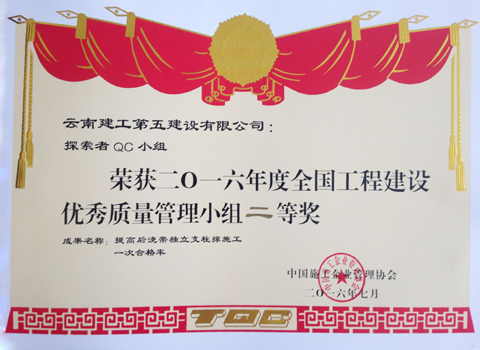 2016年7月7日,公司第四直管項目部申報的“提高屈曲約束支撐節(jié)點板安裝一次合格率”成果獲中國施工企業(yè)管理協(xié)會2016年度全國工程建設(shè)優(yōu)秀質(zhì)量管理小組一等獎;“提高后澆帶獨立柱支撐施工一次合格率”成果獲中國施工企業(yè)管理協(xié)會2016年度全國工程建設(shè)優(yōu)秀質(zhì)量管理小組二等獎。此前,該小組的以上兩項成果均獲得2016年度云南省工程建設(shè)優(yōu)秀質(zhì)量管理小組一等獎。