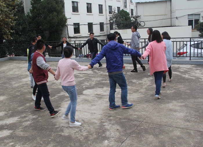 一陣歡快的歌聲在公司財(cái)務(wù)部核算中心的空地上唱起,只見一群潮氣蓬勃的新員工正圍成一圈玩著“桃花朵朵開”的游戲,大家等待著“命令”或抱成一團(tuán),或紛紛散開,在一片歡聲笑語里玩得不亦樂乎。