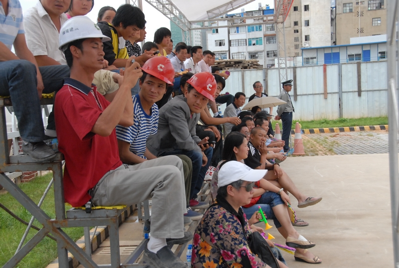 第四直管部全體籃球隊員在賽前以一曲合唱——《和你一樣》拉開了本次比賽的序幕,而相對于歌曲的清新,直管部準(zhǔn)備的口笛、塑料巴掌等“秘密武器”可是為整個比賽添加了足夠的激情與歡樂。公司機關(guān)和五〇三直管部也組織了各自的啦啦隊前往工地為隊員們加油助威。
