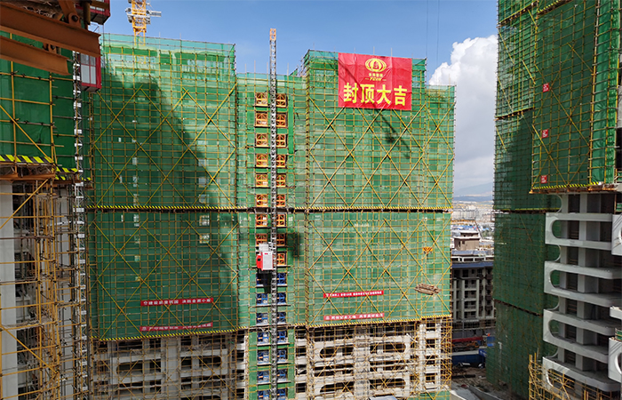 9月29日下午17:00,隨著最后一車混凝土通過輸送泵管輸送到板面上,由五〇五直管部負(fù)責(zé)施工的玉溪錦府·景明(一期)三標(biāo)段在所有參建單位中首家完成主體結(jié)構(gòu)全面封頂。