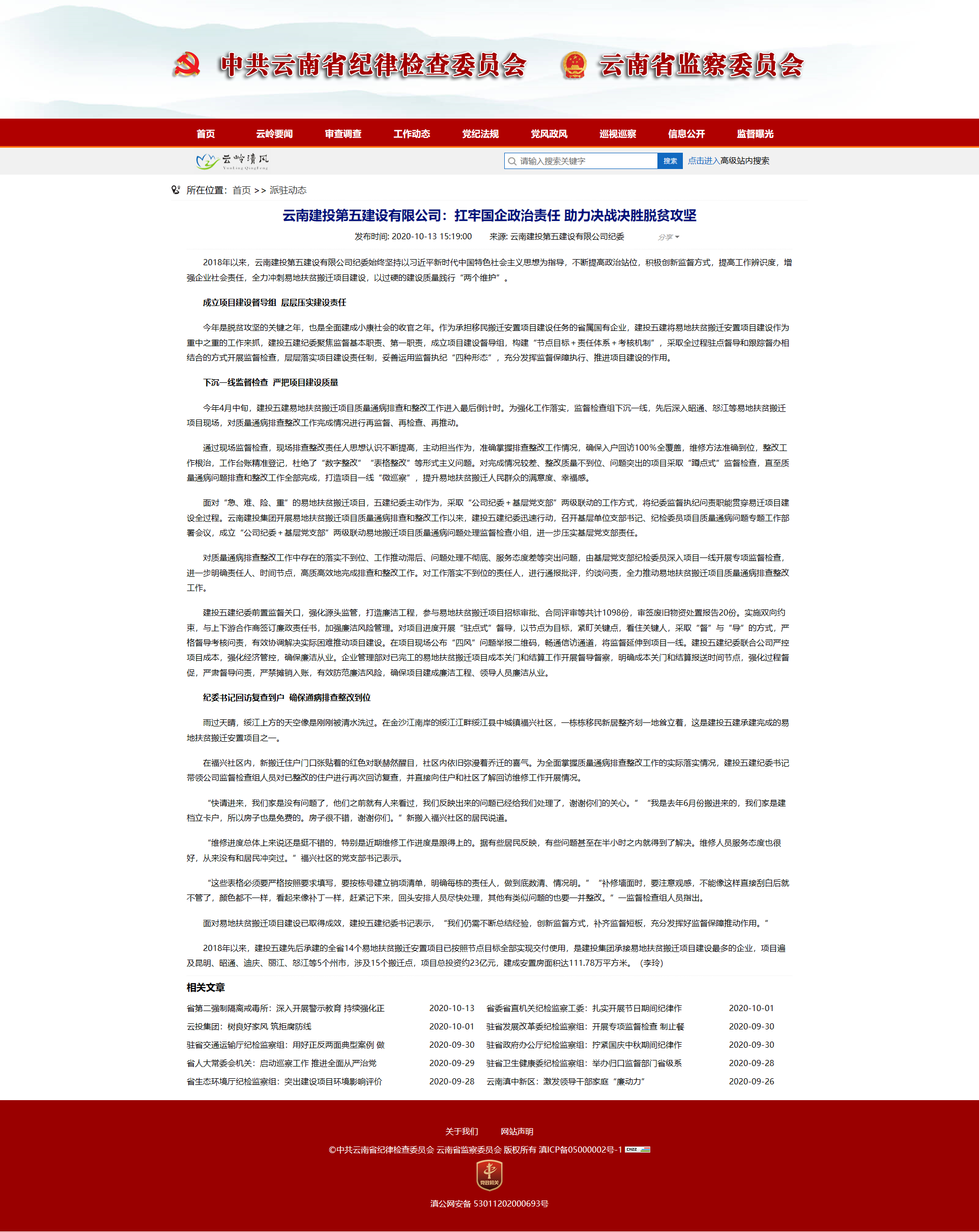 10月13日,中共云南省紀(jì)律檢查委員會(huì)、云南省監(jiān)察委員會(huì)網(wǎng)站刊登公司文章《扛牢國(guó)企政治責(zé)任 助力決戰(zhàn)決勝脫貧攻堅(jiān)》,對(duì)公司紀(jì)委自2018年以來,始終堅(jiān)持以習(xí)近平新時(shí)代中國(guó)特色社會(huì)主義思想為指導(dǎo),不斷提高政治站位,積極創(chuàng)新監(jiān)督方式,提高工作辨識(shí)度,增強(qiáng)企業(yè)社會(huì)責(zé)任,全力沖刺易地扶貧搬遷項(xiàng)目建設(shè),以過硬的建設(shè)質(zhì)量踐行“兩個(gè)維護(hù)”表示肯定。 原文鏈接:http://w...